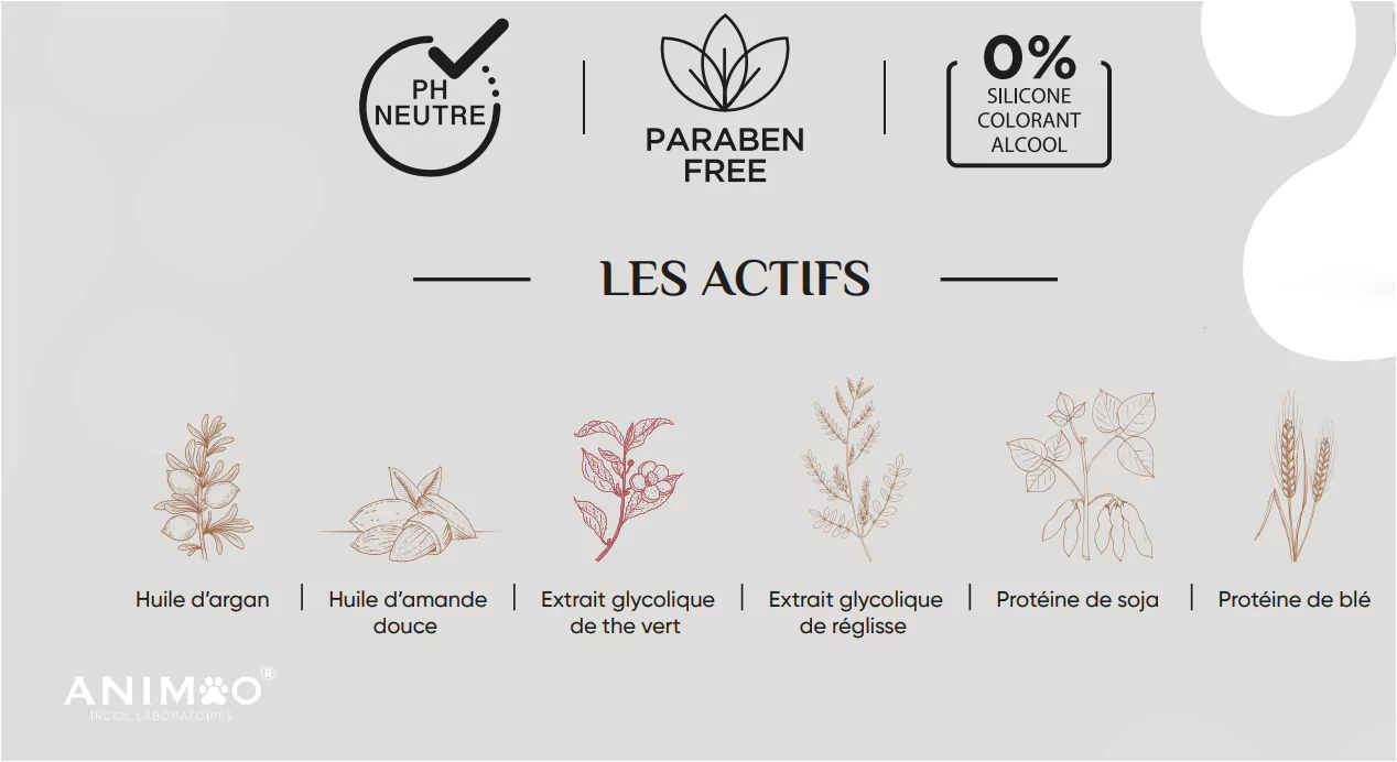 Le shampoing Eclat Poils Blancs ANIMOO convient aux chiens et chats adultes à pelage blanc. Il contient des extraits de réglisse et de thé vert qui permet d’éviter le jaunissement et raviver l’éclat des poils blancs. Ce shampoing est composé d’une base lavante douce, il n’irrite pas la peau sensible des animaux et il permet de l’hydrater et la protéger. Il ne contient pas de colorants, ni parabènes, ni silicones.