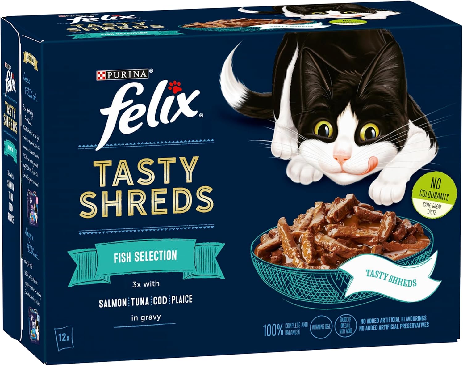 Purina FELIX Tasty Shreds Sélection de Poissons en Sauce est une nourriture humide pour chats adultes, composée de tendres effilochés de poissons en sauce savoureuse. Ce pack de 12 sachets de 85 g offre un assortiment gourmand au saumon, thon, cabillaud et plie, pour varier les plaisirs à chaque repas.