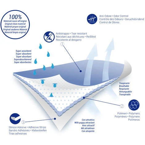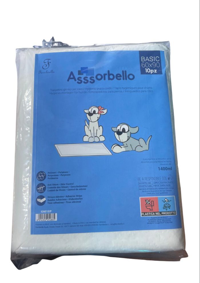 Les tapis absorbants Asssorbello Ferribiella pour chiens sont idéaux pour éduquer les chiots à salir dans des endroits bien définis, utiles pour les chiens qui ne peuvent pas quitter la maison en cas de besoin. Les tapis Assorbello contiennent de la ouate matelassée et des polymères qui transforment l’urine en gel pour éviter les déversements indésirables et pour absorber toutes les odeurs et les liquides et sont à nouveau secs après 1 minute. Les tapis Assorbello sont également équipés de bandes adhésives pour fixer le tapis au sol. Les tapis Assorbello sont également très utiles pour : – les chiens et chats malades en hospitalisation – le transport – la protection des canapés ou des couchettes