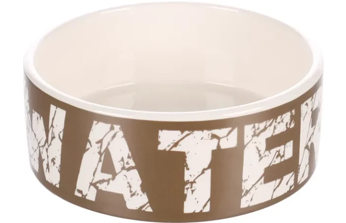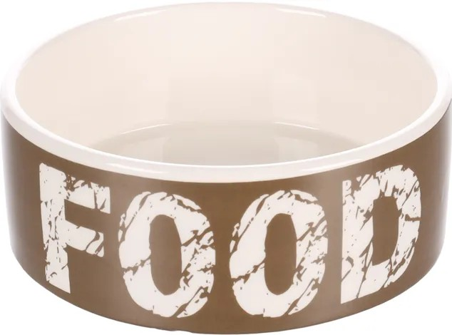 Pot à nourriture pour chien et chat en céramique taupe/blanc avec une inscription amusante. La pot peut être lavée au lave-vaisselle.