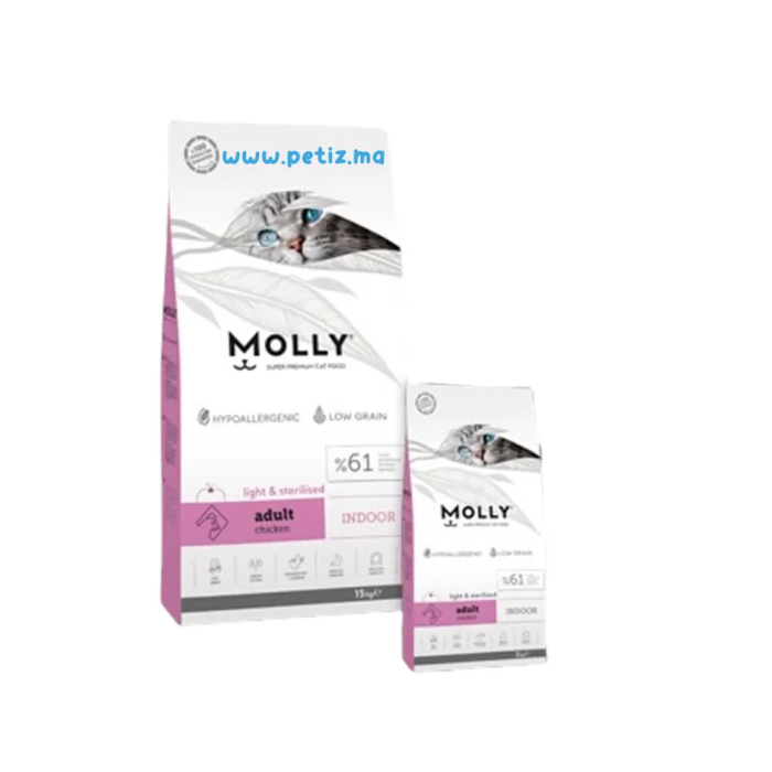 Commandez dès maintenant les croquettes MOLLY Light & Sterilised 2 kg et offrez à votre chat une alimentation adaptée à ses besoins spécifiques. Livraison partout au Maroc avec paiement à la livraison.