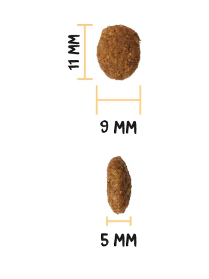 Protéine : 37 %, teneur en matières grasses : 13 %, cellulose brute : 4,5 %, matière inorganique : 8 %, humidité : 8 %, oméga 6 : 1,8 %, oméga 3 : 0,5 %, calcium : 1,1 %, phosphore : 1 %. Énergie métabolisable : 3 700 kcal/kg.