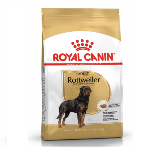 ROYAL CANIN® Rottweiler Adult est spécialement formulé pour répondre à tous les besoins nutritionnels de votre chien adulte et convient aux Rottweilers âgés de 18 mois et plus. ROYAL CANIN® Rottweiler Adult contient des nutriments spécifiques tels que la taurine, l’EPA et le DHA, qui renforcent la bonne santé cardiaque. ROYAL CANIN® Rottweiler Adult contribue également au maintien d’une masse musculaire et d’un poids de forme idéaux grâce à sa teneur en protéines adaptée et à son apport en L-Carnitine. Cette alimentation – rationné de façon appropriée afin de réguler la prise alimentaire – doit être complété par un programme d’exercice physique efficace. Au travail ou en promenade, le Rottweiler est toujours actif et enthousiaste, ce qui signifie qu’il a besoin de nutriments spécifiques pour entretenir et renforcer ses os et ses articulations. C’est pourquoi ROYAL CANIN® Rottweiler Adult est enrichi en EPA et DHA, des acides gras oméga-3 qui contribuent à la bonne santé des os et des articulations de votre chien. De plus, les croquettes exclusives de ROYAL CANIN® Rottweiler Adult sont spécialement conçues pour faciliter la prise de nourriture de votre chien et l’encourager à la mâcher davantage pour améliorer la sensation de satiété et maintenir son poids de forme.