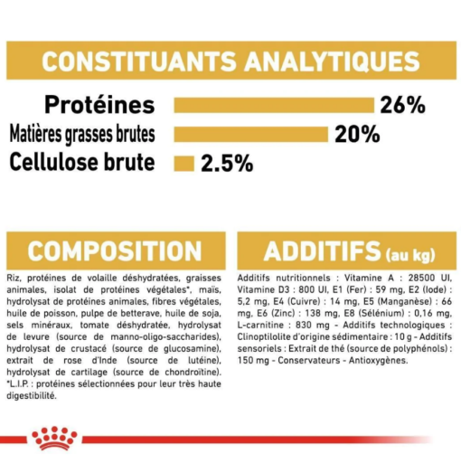 Constituants analytiques : Protéine : 26,0 % – Teneur en matières grasses : 20,0 % – Cendres brutes : 6,4 % – Cellulose brute : 2,5 % – Au kg : EPA/DHA : 5 g – Taurine (totale) : 2,5 g.
